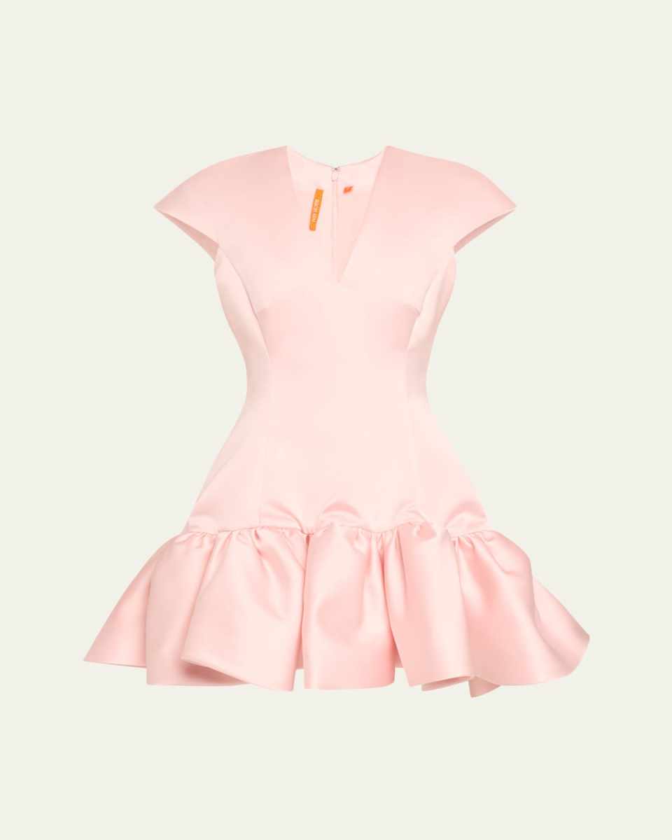 Bach Mai "Volant" satin dress features a flared ruffle hem Approx. 35"L from shoulder to hem V neckline Cap sleeves; approx. 4.0"L Mini length Fit and flare silhouette Zip closure Polyester Silk lining Dry clean Made in USA from imported materials