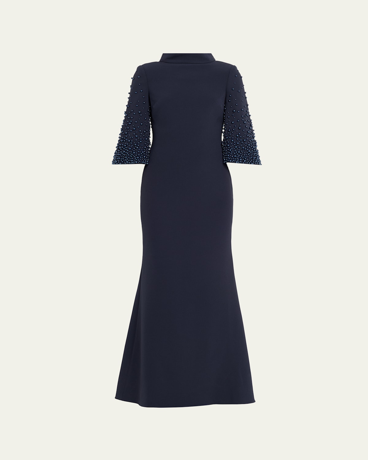 Crafted of crepe, this Badgley Mischka gown features pearlescent beads cascading down each sleeve Funnel neckline 3/4 sleeves Full length Trumpet silhouette Invisible back zipper Polyester/spandex Lining: Polyester Spot clean Imported
