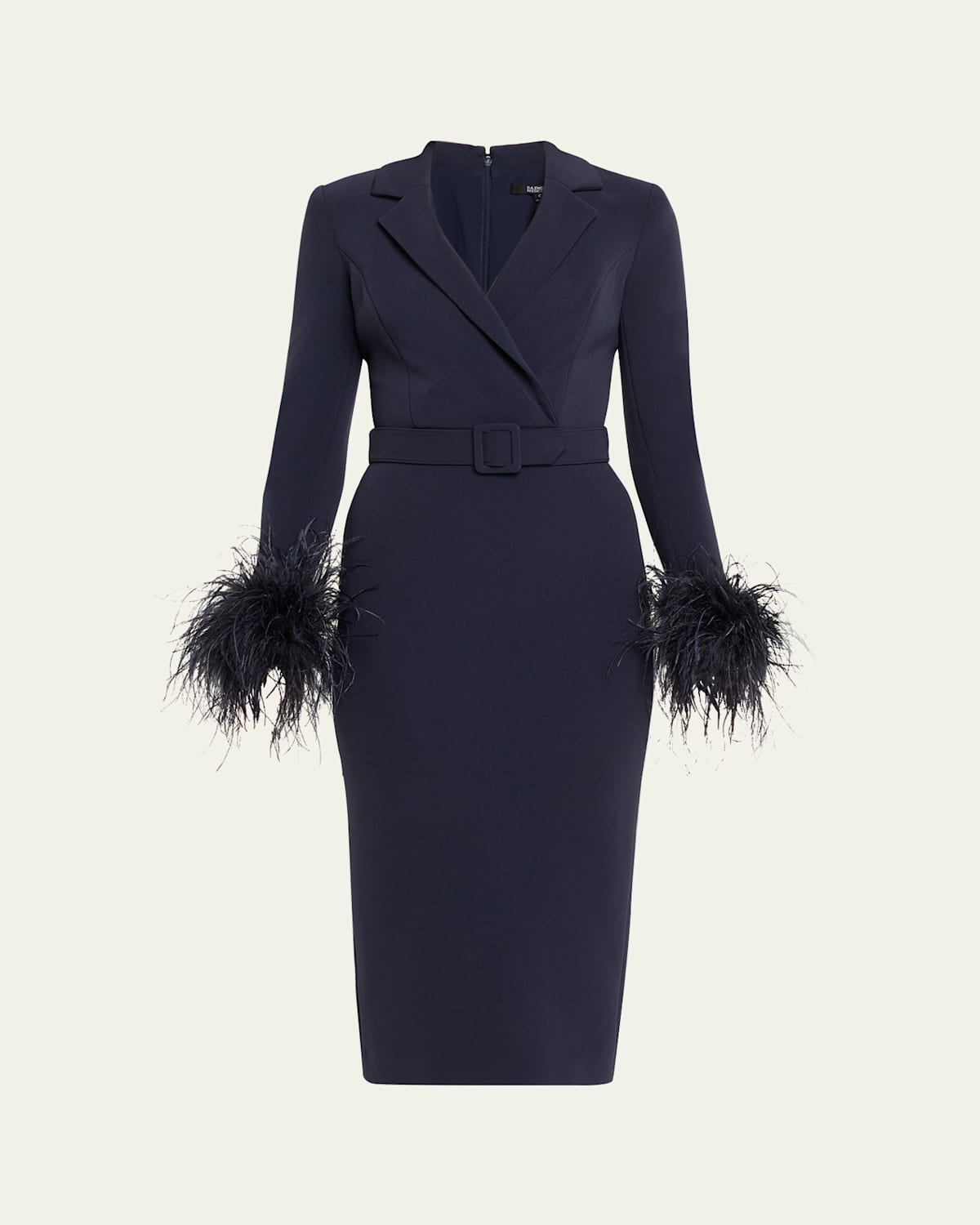 This Badgley Mischka blazerstyle midi dress is finished with a matching belt on the waist and playful ostrich feather cuffs Notched lapels Long sleeves Princess seams Center back slit Hem falls below the knee Sheath silhouette Invisible back zipper Polyester/spandex Lining: Polyester Dry clean Imported