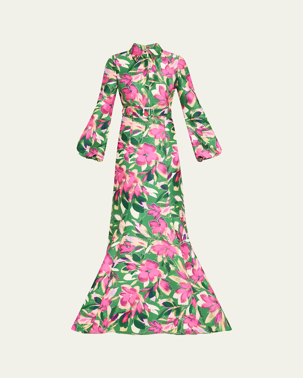 Badgley Mischka shirt gown in floralprint mikado with matching belt Approx. 61"L from shoulders to hem Point collar; concealed button front Long blouson sleeves; approx. 27"L Full length Trumpet silhouette Invisible back zipper Polyester/spandex Lining: Polyester Dry clean Imported