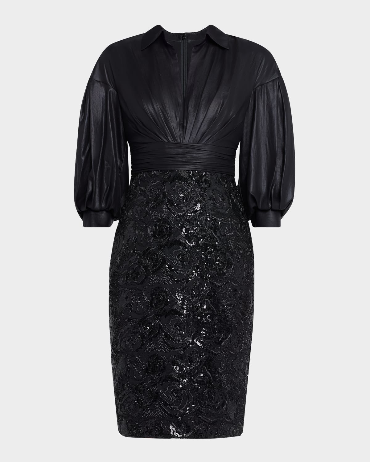 Badgley Mischka Collection combo shirtdress with sequin floral skirt and pleated bodice Approx. 40.5"L from shoulders to hem V neckline with spread collar Drop shoulders 3/4 blouson sleeves Button cuffs Empire waist Center back slit Hem hits around the knee Bodycon silhouette Invisible back zipper Polyester Imported