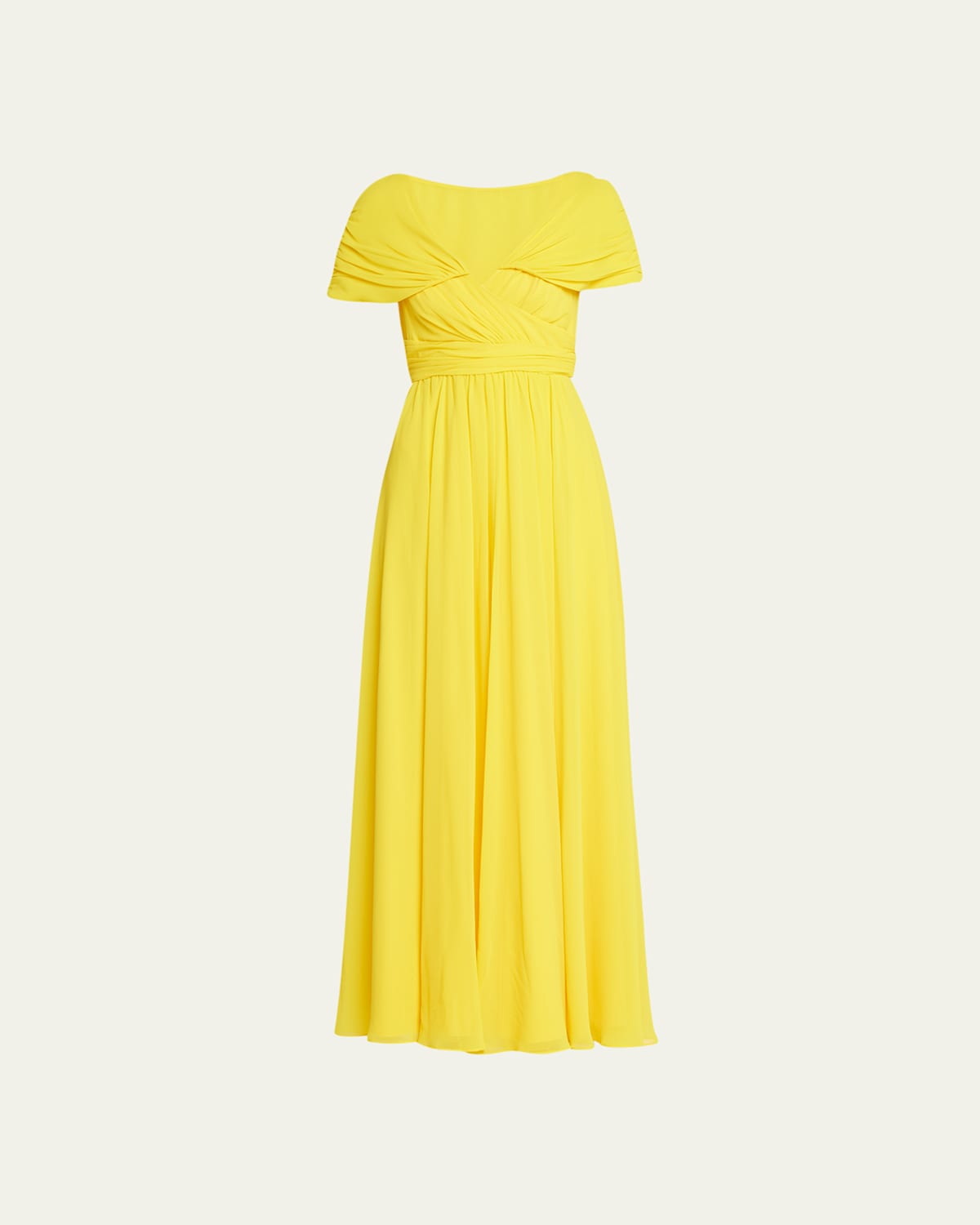 Badgley Mischka Collection ruched gown with crossover bodice V neckline Short sleeves Empire waist Floorlength Aline silhouette Invisible back zipper Polyester Lining: Polyester Dry clean Imported