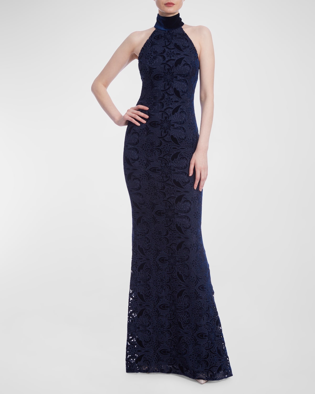 Badgley Mischka Collection gown in floral velvet lace Approx. 59"L from shoulders to hem Halter turtleneck Sleeveless Full length Trumpet silhouette Invisible back zipper Polyester Imported
