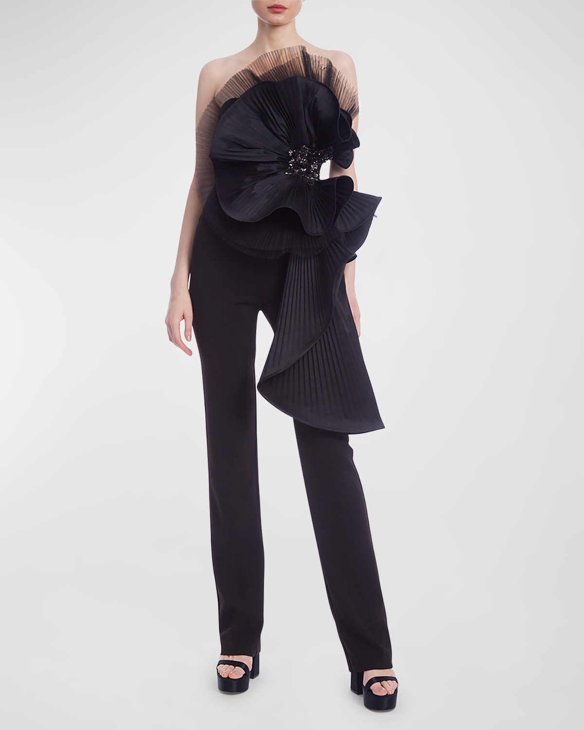 Badgley Mischka Collection jumpsuit with rhinestoneembellished pleated fan ruffle Strapless neckline Sleeveless Full length Slim, straight legs Invisible back zipper Polyester/spandex Lining: Polyester Spot clean Imported