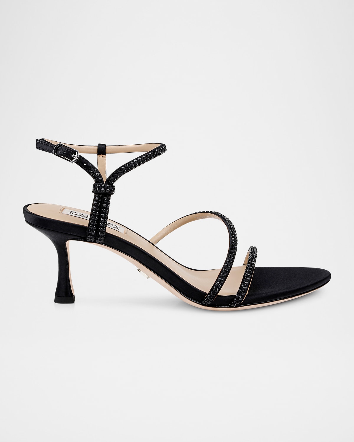 Badgley Mischka "Julianna" silk sandals with a crystal embellishment 2.50 in / 65 mm kitten heel Open toe Dual midvamp strap Adjustable ankle strap Leather lining and outsole Professional cleaning recommended Imported