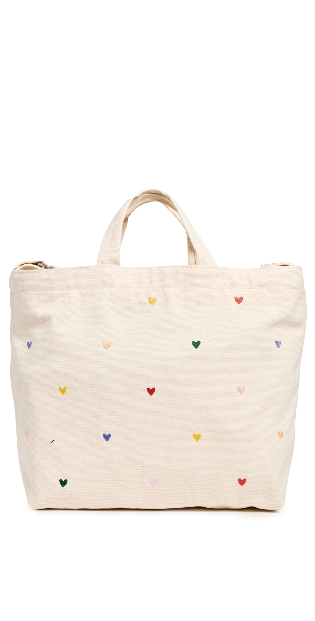 Canvas. Embroidered heart pattern. Zip at top. Patch interior pockets. Adjustable strap. Unlined. Weight: 12oz / 0.34kg. Imported, China. Measurements: Height: 11.75in / 30cm Length: 16.5in / 42cm Depth: 4.25in / 11cm Strap drop: 7in / 18cm Handle drop: 4.25in / 11cm