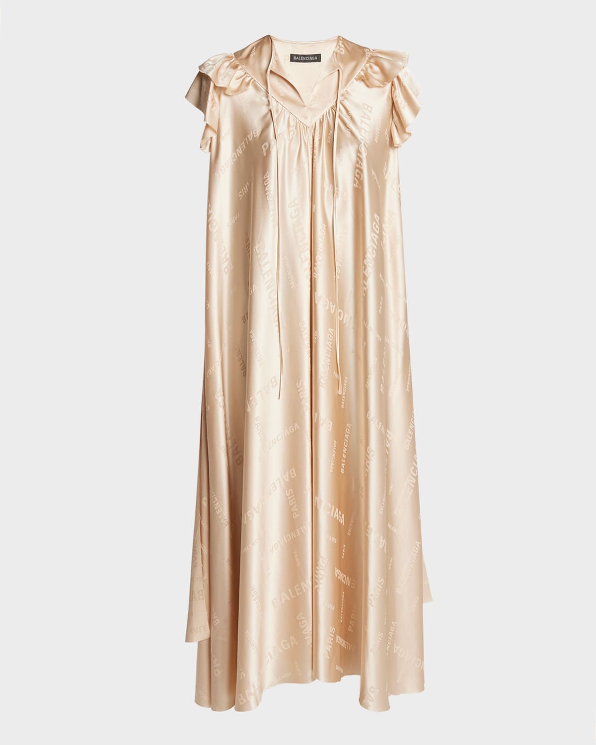 Balenciaga logo Paris silk jacquard oversized dress featuring gathering, ruffles, and a selftie neck Round neckline; split V front Cap sleeves Side split pockets Shift silhouette Hem falls below the knee Slipover style Silk Made in Italy