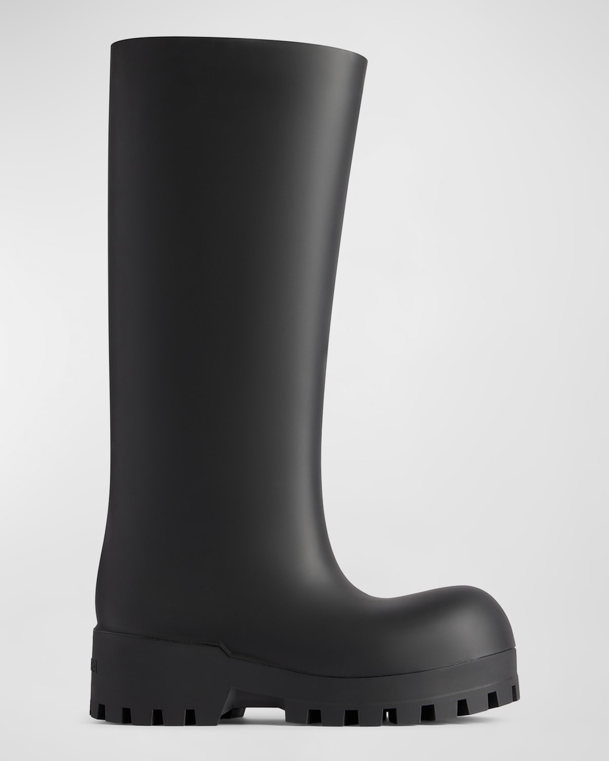 Balenciaga tall TPU rubber rain boots Flat chunky heel Round toe Pullon style Lugged rubber outsole Imported
