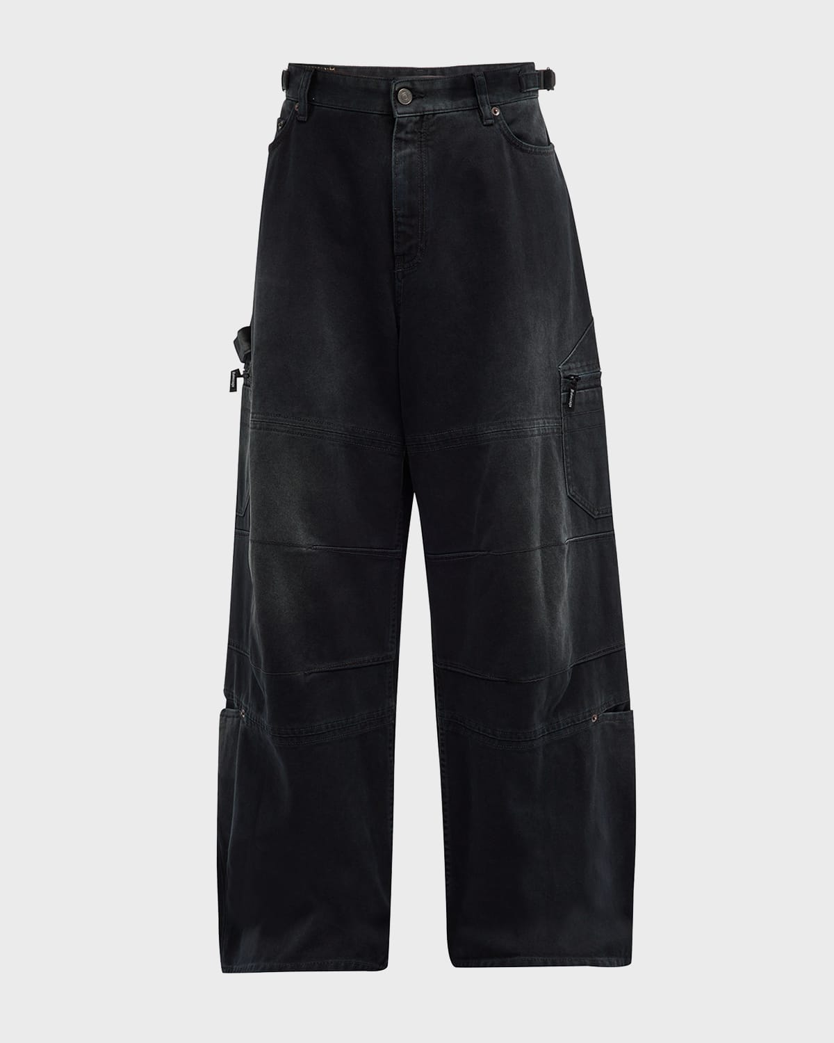Soft black left hand denim This item is unisex Large fit Midwaist Covered zip fly 5 belt loops 2 belt tabs on sides to adjust waistline 2 slash pockets at front 1 watch pocket at front 2 buttoned pockets at back 1 zipped patch pocket on each side 1 slash pocket on each lower leg side Tool loop at back right Balenciaga engraved flex buttons Balenciaga jeans patch at back Balenciaga logo printed on zipper pull tabs Made in Italy Dry cleaning Model is 188 cm / 6'2" and is wearing a size S