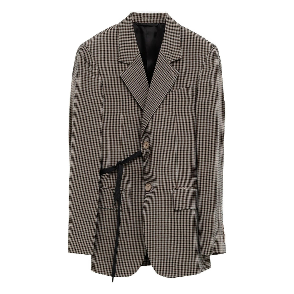 khaki and brown check print tie detail button fastening notched lapels front flap pockets long sleeves