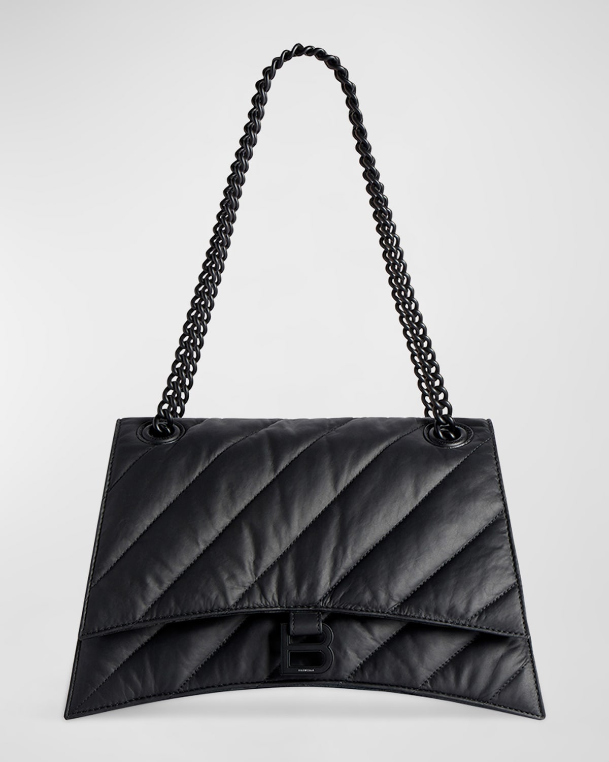 Dimensions: L12,2 x H7,8 x W2,7 inch Quilted satin trompe l'oeil calfskin Chain bag Curvilinear base Shoulder and crossbody chain strap (19,6 inch) Matte black B logo hardware Studded magnet closure 3 compartments 1 inner zipped pocket 1 inner flat pocket Napa lambskin lining Made in Italy Wipe with a soft cloth