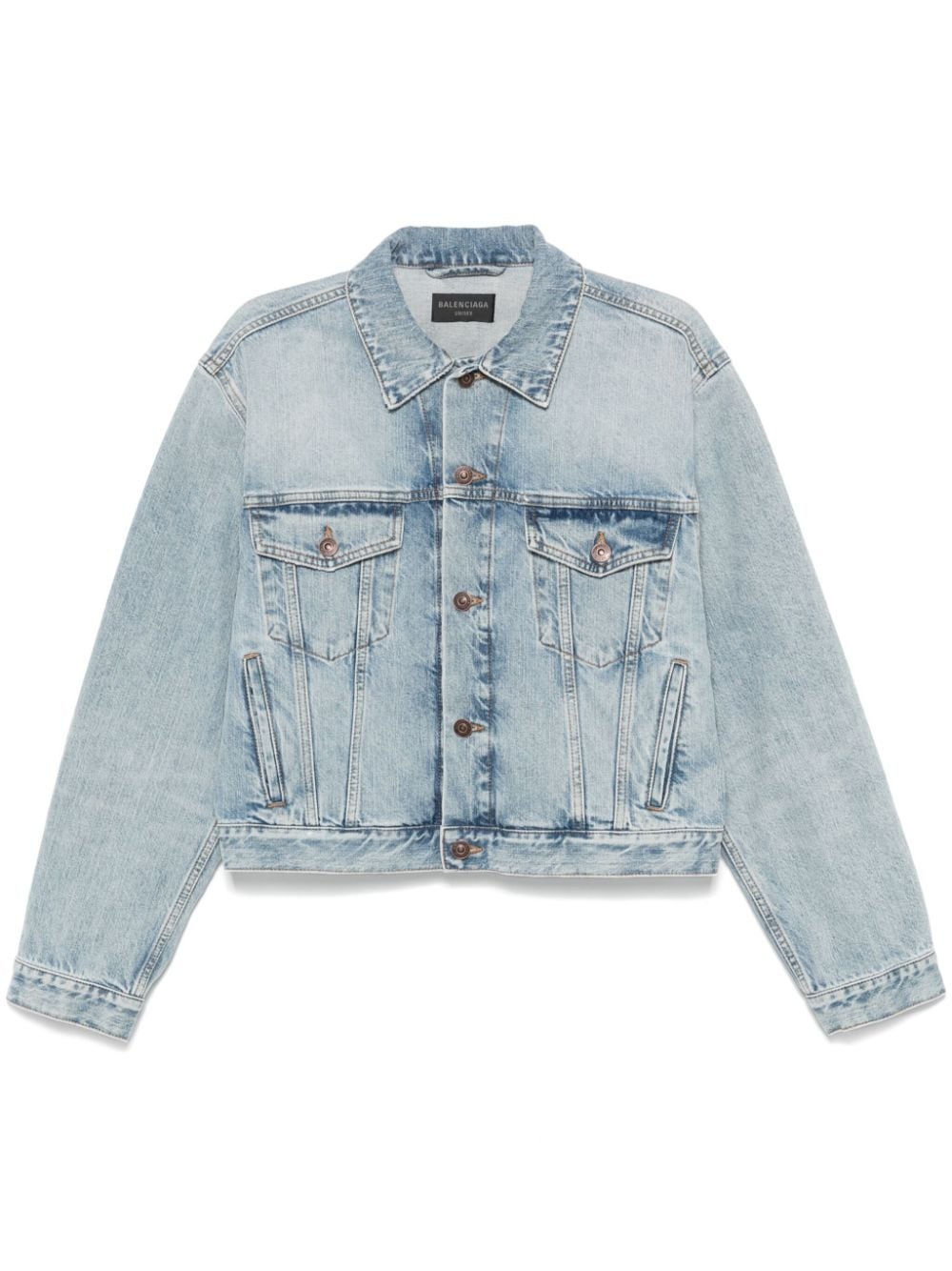 light blue cotton denim front button fastening spread collar two button-fastening chest pockets long sleeves buttoned cuffs two side welt pockets logo patch to the rear waist tabs straight hem When buying this unisex item, keep in mind that it is graded in standard men's sizing.