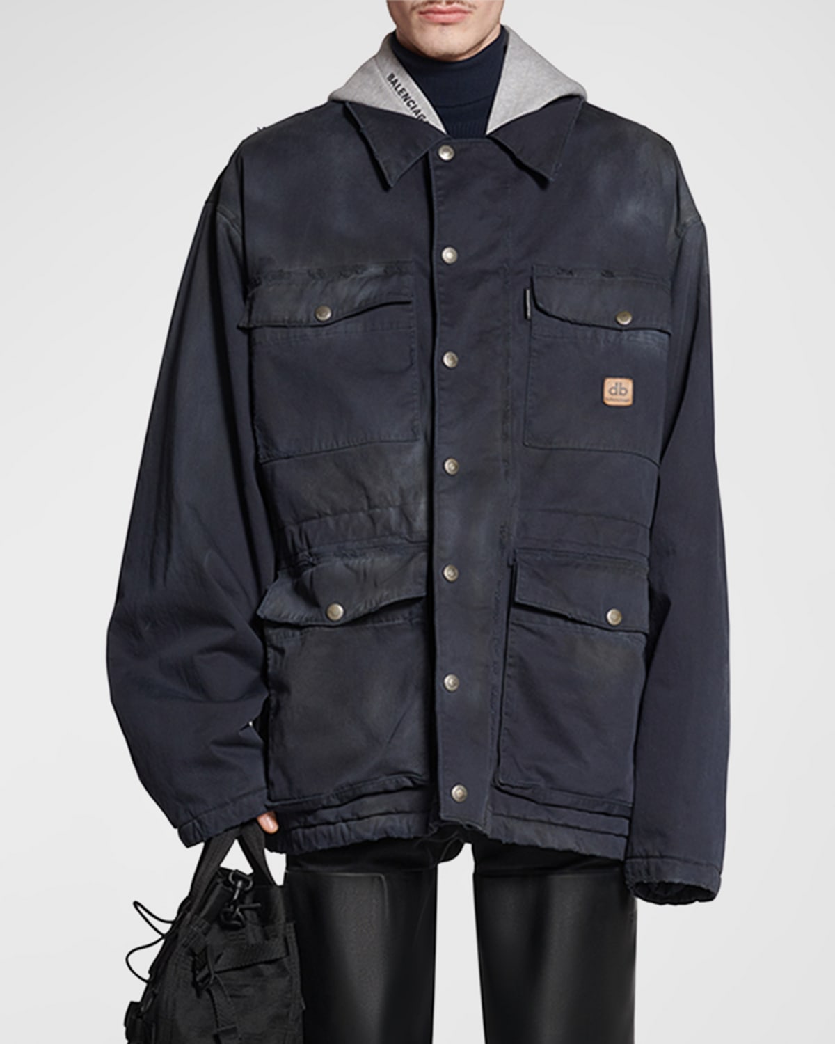 Stretch gabardine and medium curly fleece This item is unisex Oversize fit 2 fabric panels assembled together Attached hood without drawstring Concealed zipped closure with snap buttons 2 patch pockets at chest 2 cargo pockets at front Drawstring at waistline Balenciaga logo embroidered on right side of hood Balenciaga tag at chest Double B logo inlaid patch at chest Wornout, washedout and dirty effect Made in Italy Dry cleaning