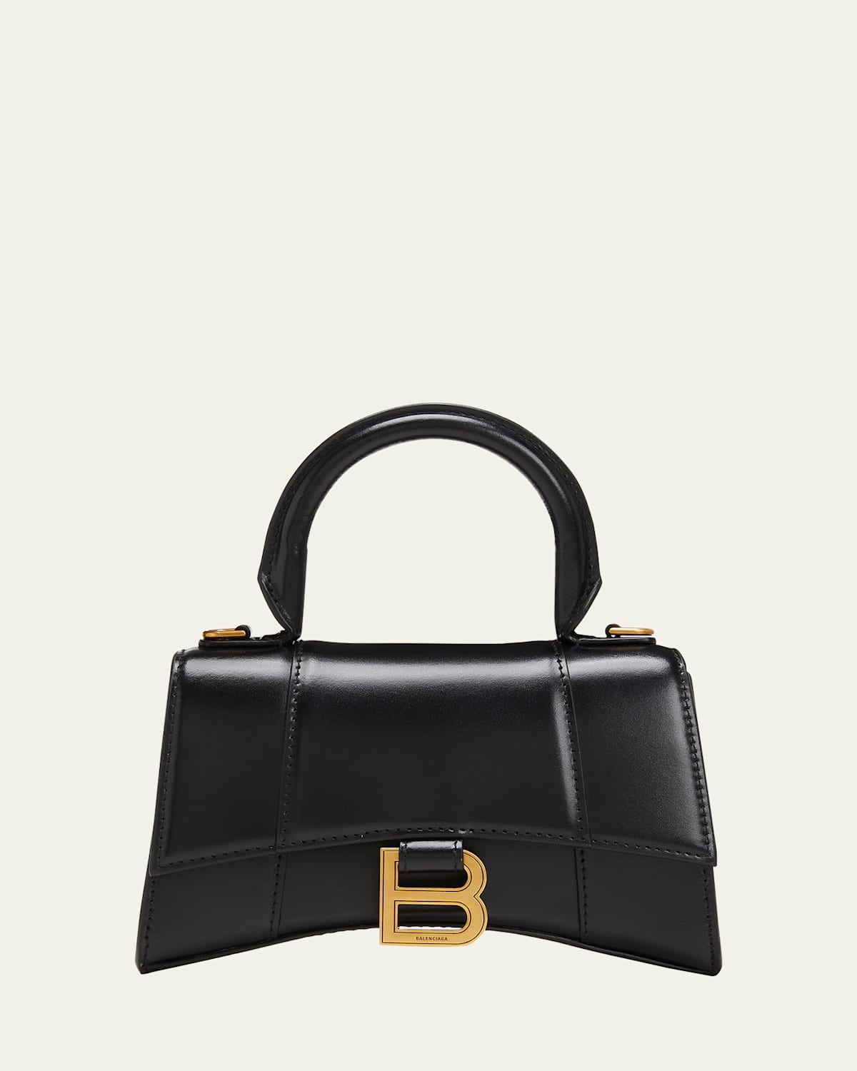 Balenciaga tophandle bag in shiny box calf leather with curvilinear base. Rolled, padded top handle. Removable, adjustable shoulder strap, 21.7" drop Flap top with metal B hardware; snap closure. Exterior, slip compartment at back. Interior, one slip pocket. Napa lambskin lining. Wipe with a soft cloth. 5.1"H x 7.5"W x 3.1"D. Made in Italy.