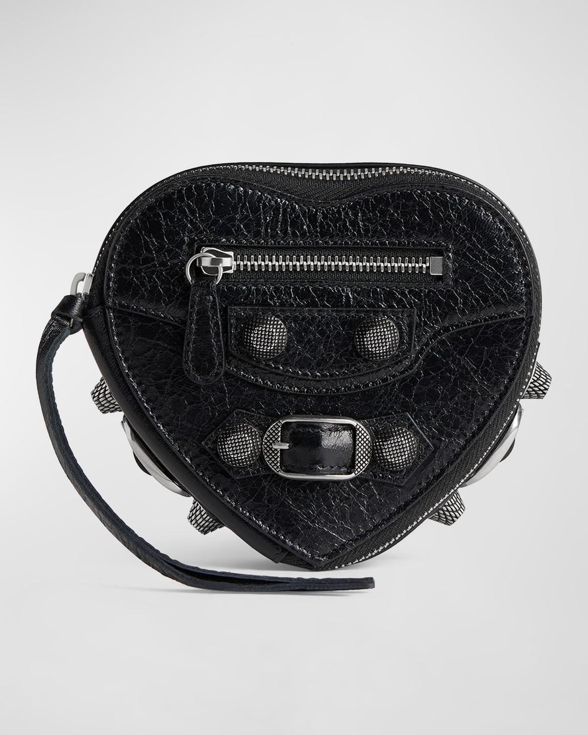 Balenciaga "Le Cagole" heart jewelry box in leather Balenciaga logo embossed toneontone at back Agedsilver hardware Front zipped pocket Zipped closure with knotted leather puller 1 main compartment Lambskin lining Approx. 4.5"H x 5.1"W x 2"D Wipe with a soft cloth Made in Italy