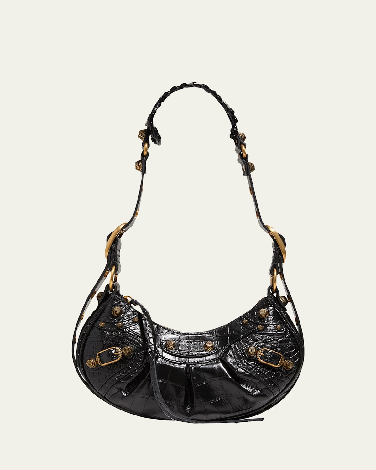 Balenciaga "Le Cagole" shoulder bag in supple crocembossed calf leather Features golden studded and buckle hardware Adjustable padded braided leather shoulder strap, 18.1"L Zip top closure with leather pull Exterior, one removable zip pouch bag and one removable heart mirror Approx. 6.3"H x 10.2"W x 2.7"D Wipe clean Made in Italy