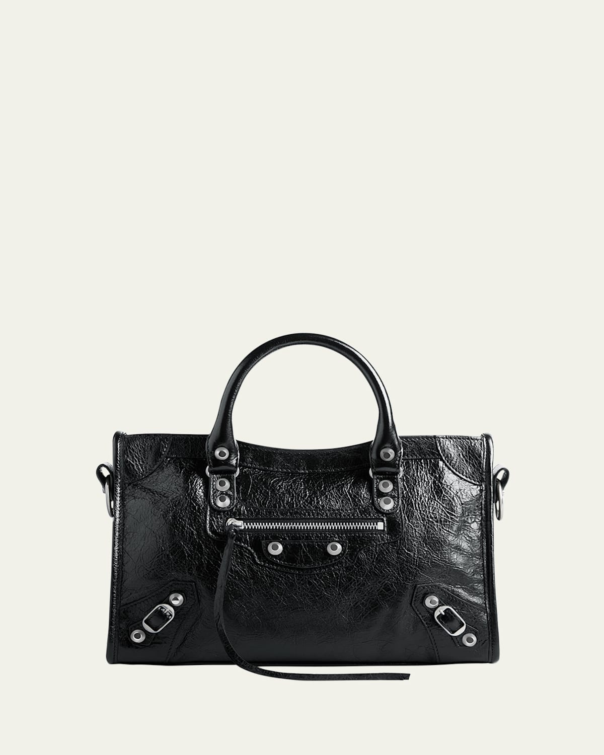 Balenciaga "Le City" shoulder bag in lambskin leather Top handles Detachable, adjustable shoulder strap Can be worn as a top handle or shoulder bag Zip top closure Exterior, front zip pocket Approx. 7.5"H x 11.8"W x 3.9"D Made in Italy