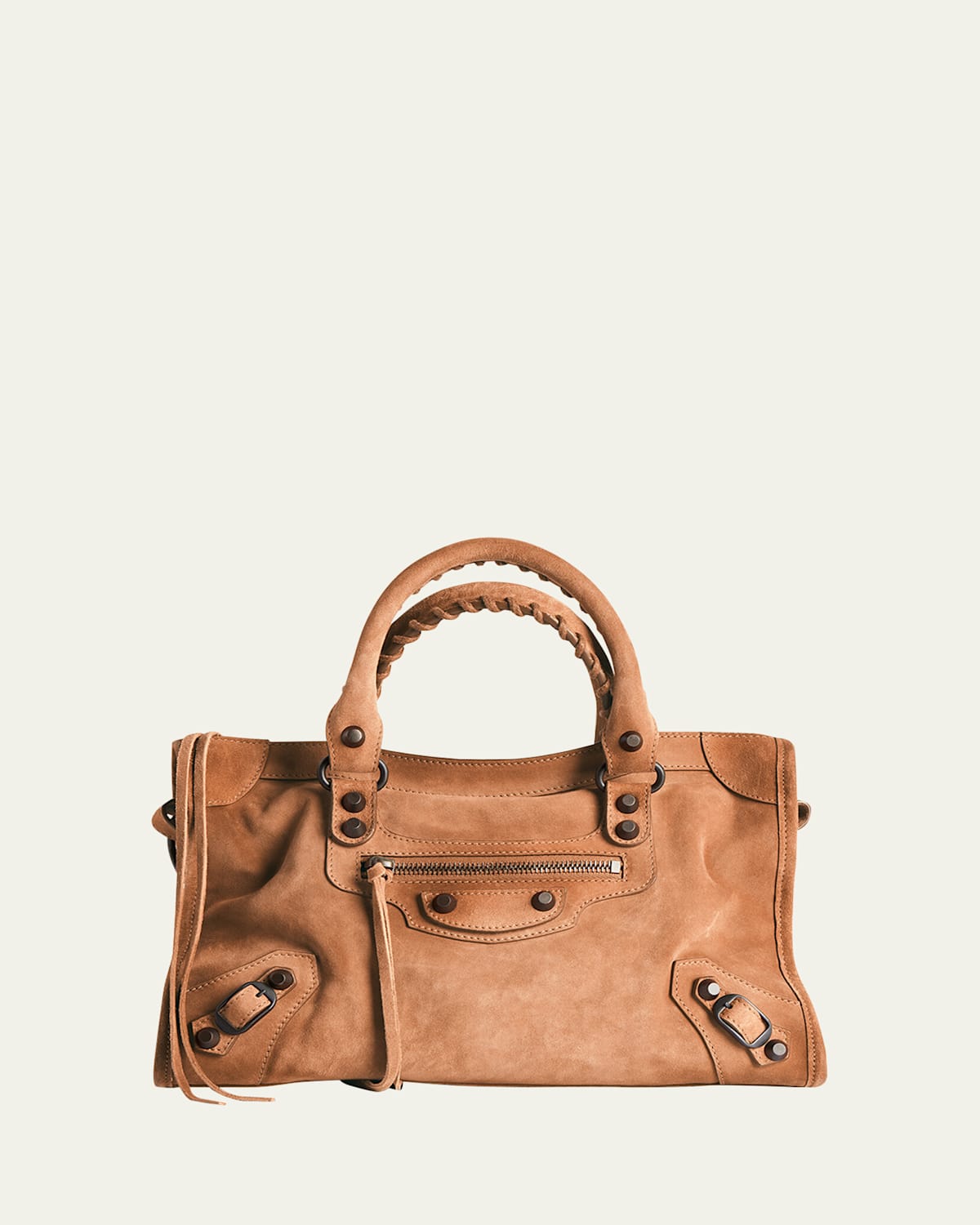 Balenciaga "Le City" small top handle bag in waxedeffect suede Handbraided top handles Detachable, adjustable shoulder strap, 19.7" drop Can be worn as a top handle or shoulder/crossbody bag Zip top closure with knotted leather pull Front zip pocket with knotted leather pull Interior, one zip pocket Cotton canvas lining Approx. 7.5"H x 11.8"W x 3.9"D Made in Italy
