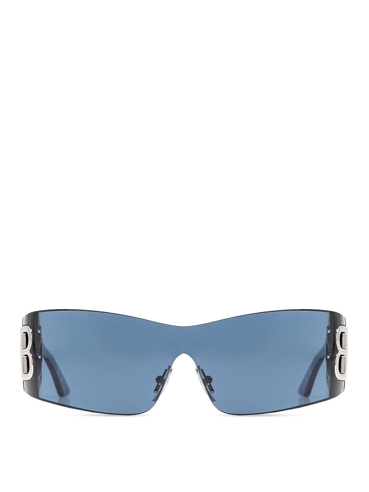 Monture bleue avec protection latérale, branches à cadre ouvert avec logo, branches surdimensionnées, branches à bout incurvé