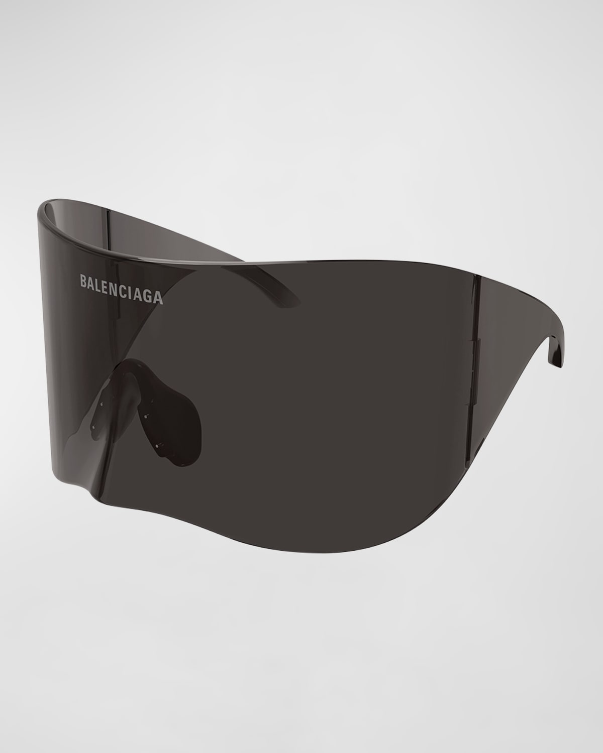 Balenciaga "BB0288S" oversized shield sunglasses in nylon/polyamide Lens/bridge/temple (in mm): 991100 Logo on center of lens Saddle nose bridge Wide, tapered arms 100% UVA/UVB protection Made in Italy