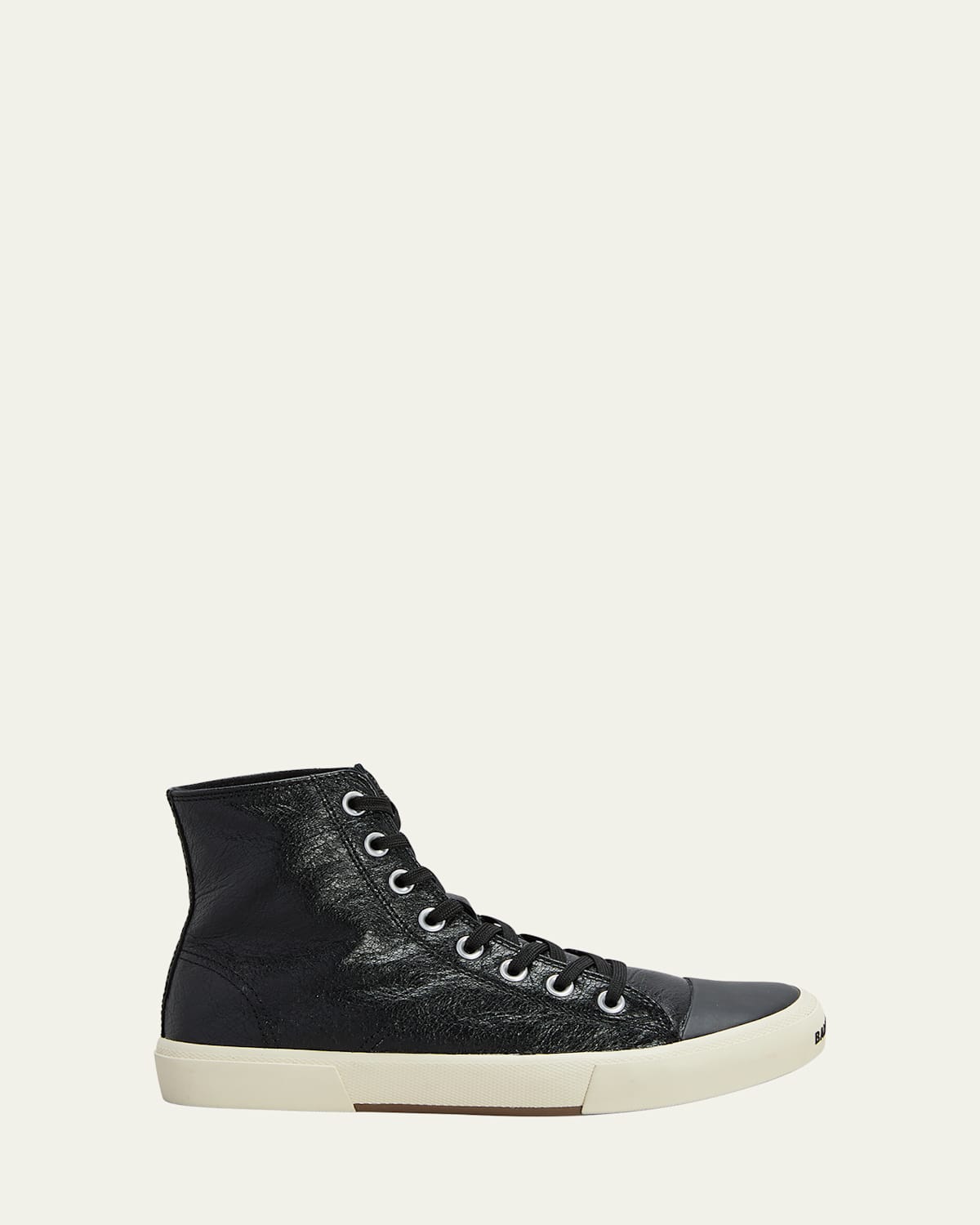Balenciaga "Paris" leather and fabric hightop sneakers Flat heel Round toe Laceup vamp Rubber outsole Made in Italy