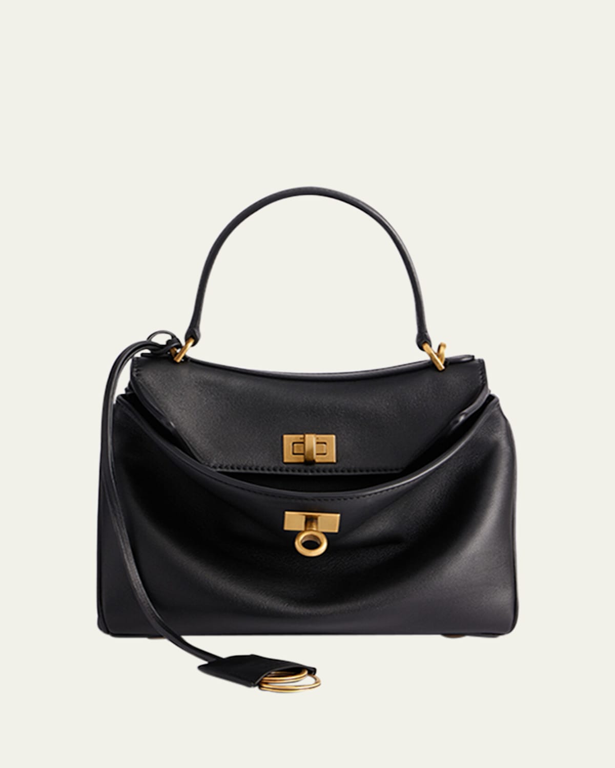 Balenciaga "Rodeo" top handle bag in smooth calfskin leather Top handle with keyring tag Foldover flap top with turnlock closure Exterior, two back slip pockets Feet protect bottom of bag Approx. 3.9"H x 9"W x 3.3"D Made in Italy