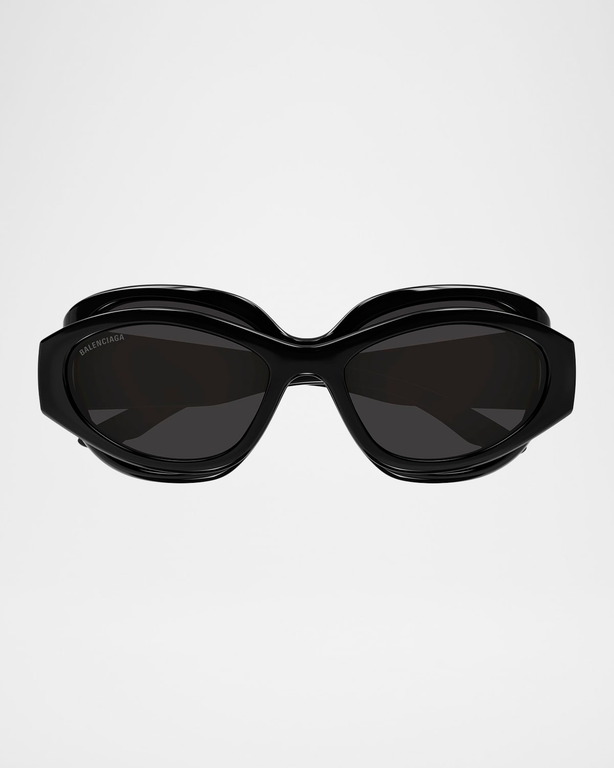 Balenciaga "BB0456S" oval sunglasses showcase a bold, modern silhouette Eye/bridge/temple (in mm): 5519145 Monochromatic lenses; logo at right lens Saddle nose bridge Monogram logo at temples Wide, tapered arms Acetate 100% UVA/UVB protection Made in Italy