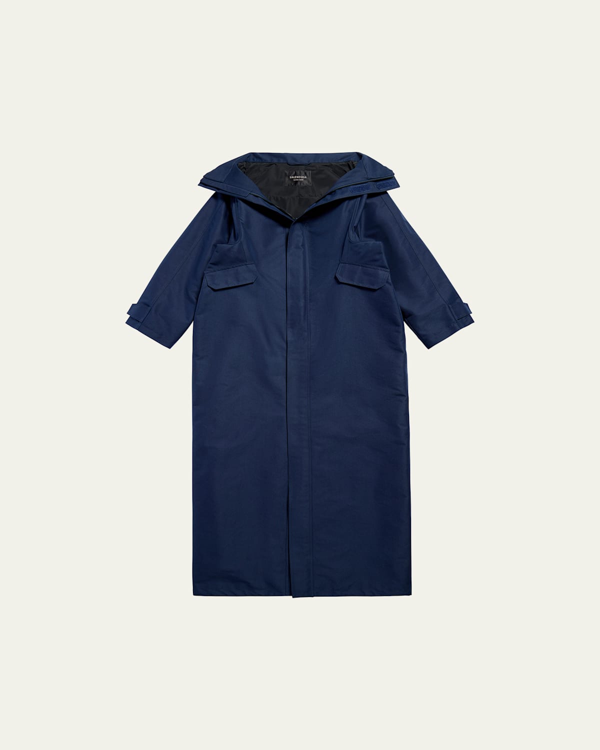 Balenciaga technical cotton canvas swing parka High standup collar; concealed zip and snap closure Elbowlength sleeves; adjustable hook and loop straps at cuffs Two snap flap pockets at front Swing shape Large fit Maxi length Nylon/polyamide/cotton Made in Italy