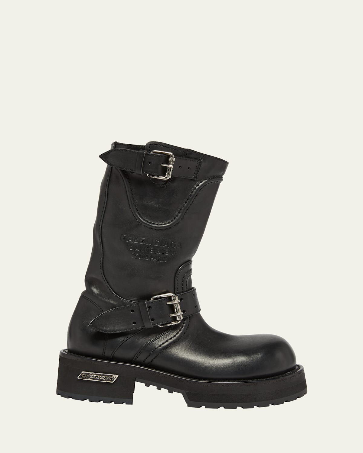 Balenciaga "Venom" moto boots in smooth calf leather with embossed side logo Chunky heel Round toe Buckle straps at ankle and collar Pullon style Rubber outsole Lining: Unlined Made in Italy