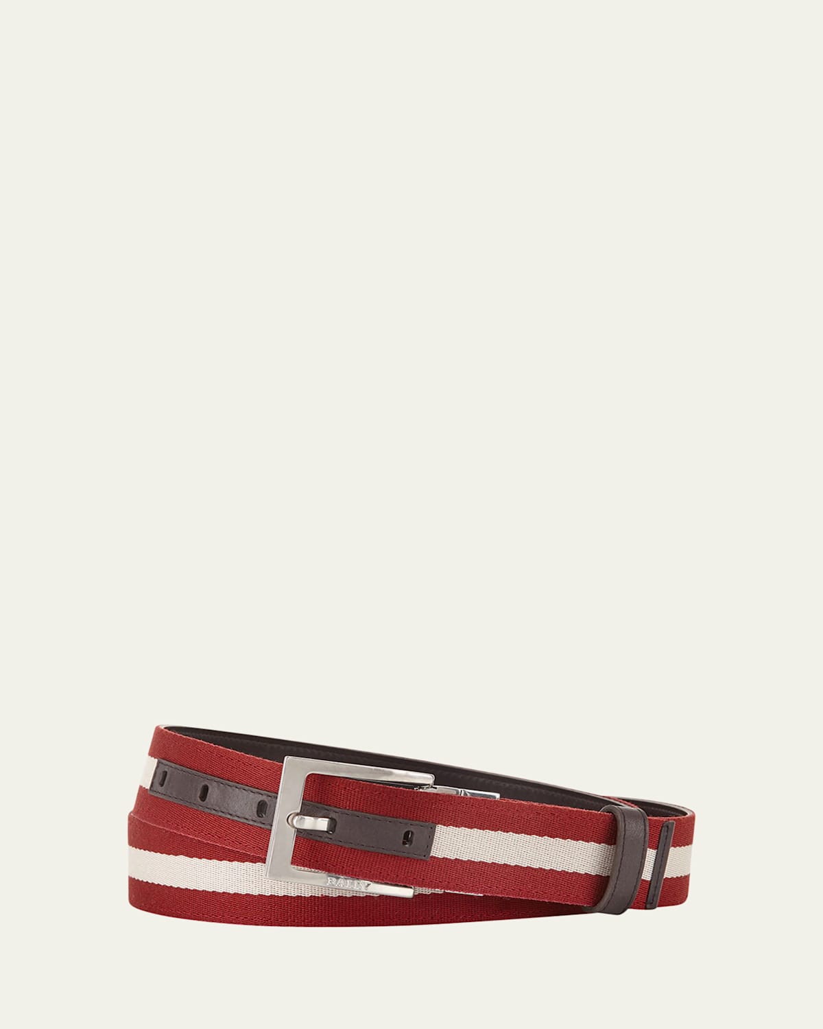 Striped web reverses to solid calfskin by Bally. Silvertone buckle. Fivehole adjustment. Made in Italy.