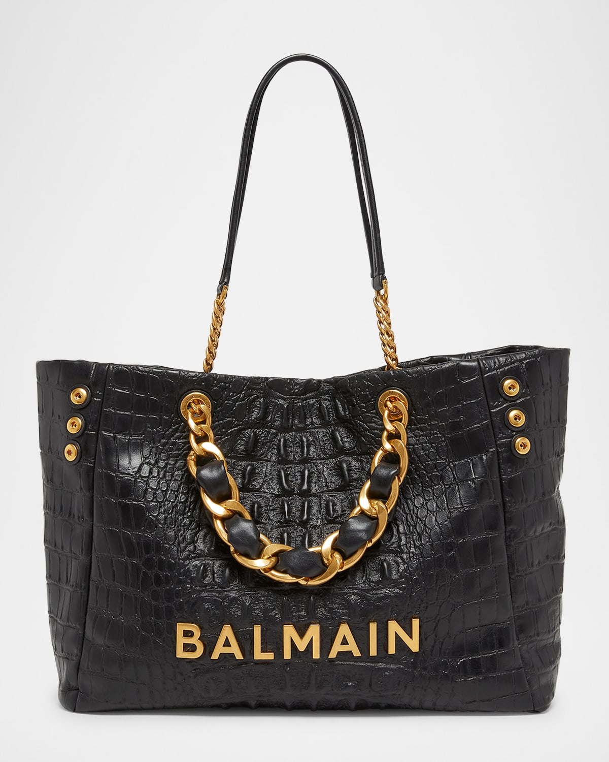 This slightly slouchy Balmain "1945" tote bag is crafted in richly textured crocembossed leather with snaps on the sides for versatile shaping Detachable leatherwoven chain top handles Detachable chain/leather shoulder straps Can be worn as a top handle or shoulder bag Open top with magnetic closure Interior, one zip pocket, one card slot Twill lining Feet protect the bottom of the bag Approx. 11.8"H x 15.7"W x 5.3"D Spot clean Made in Italy