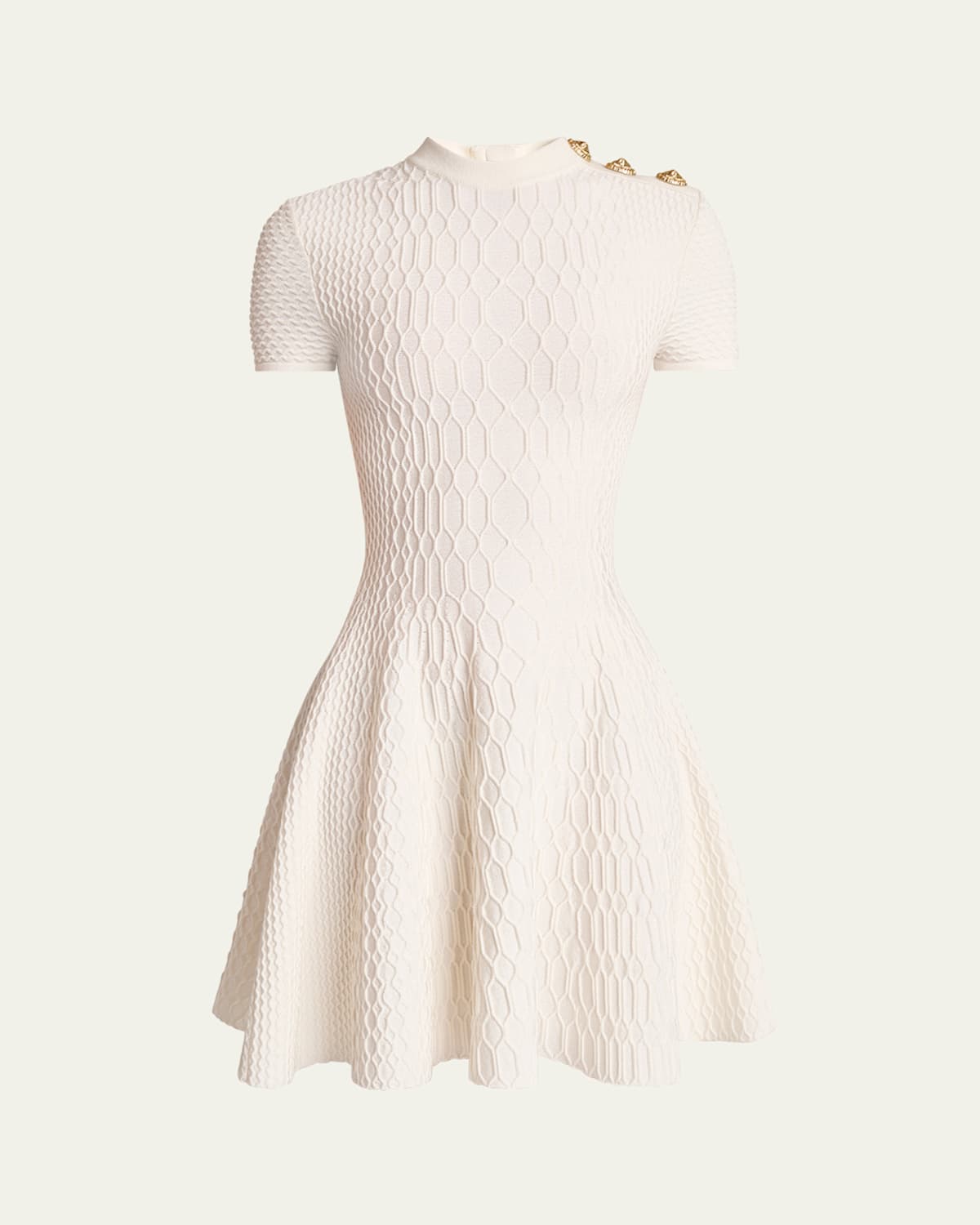 Balmain dress in sumptuous crocoknit elevated by three signature lionhead buttons at the shoulder for a chic, Italianmade statement Round neckline Short sleeves; ribbed cuffs Fitandflare silhouette Mid thigh length Back zip Viscose/polyester Professional cleaning recommended Made in Italy