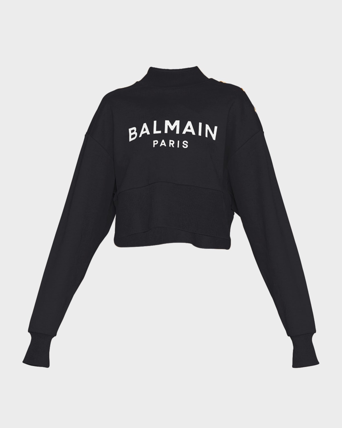 Balmain sweatshirt featuring logo printed front and signature goldtone threebutton shoulder Crew neckline Long sleeves; ribbed cuffs Relaxed fit Cropped length Wide ribbed hem Pullover style Organic cotton Imported