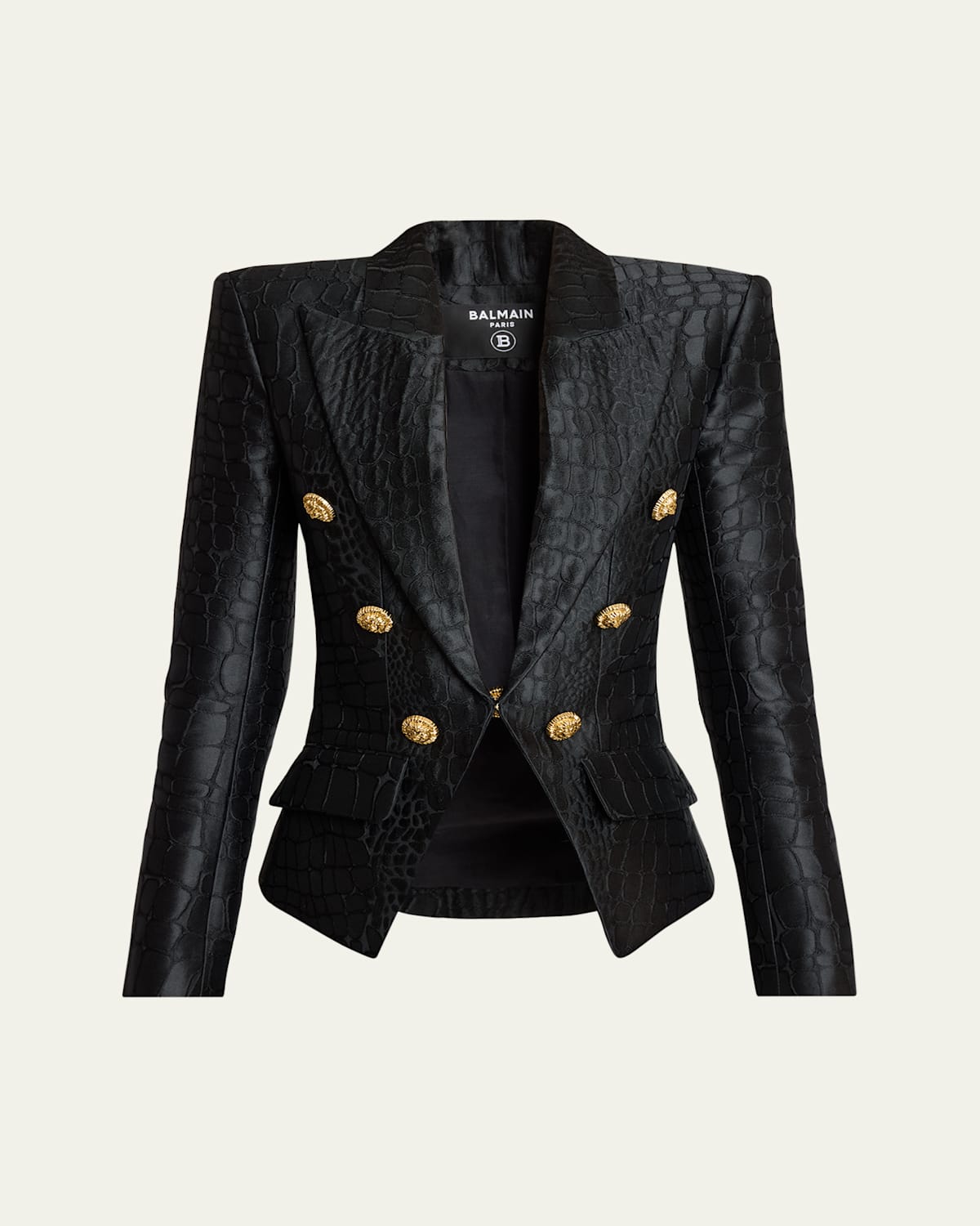 A luxe reinterpretation of power tailoring, this Balmain jacket is crafted in textured crocojacquard with an iconic lionhead sixbutton front, cultivating fierce elegance in every detail. Peak lapels; hookandeye front Long sleeves; button cuffs Padded shoulders Chest welt pocket Hip flap pockets Slim fit Hip length Viscose/cotton Professional cleaning recommended Made in Bulgaria
