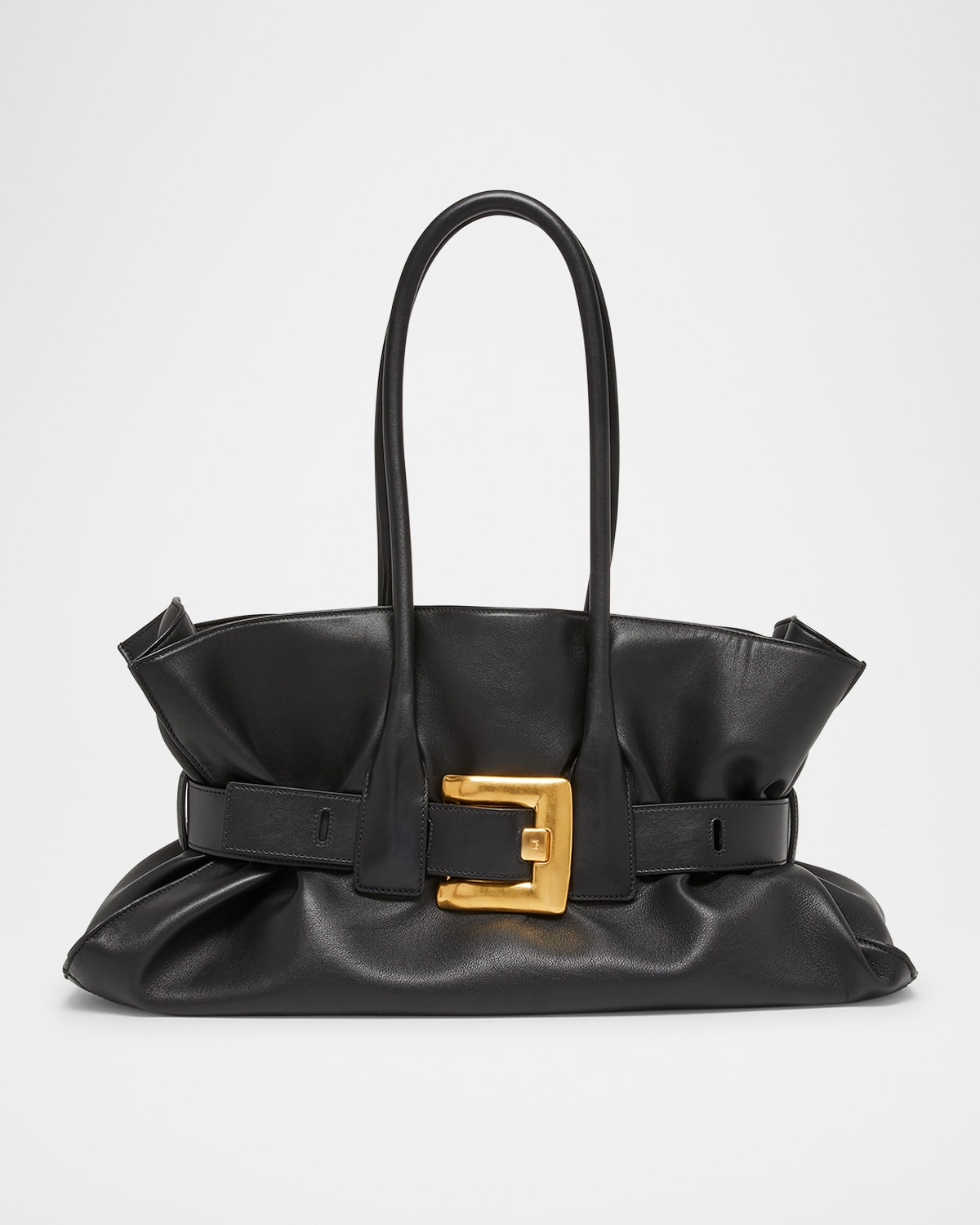 Crafted in soft calfskin leather, this Balmain "Anthem" tote bag is cinched with an attached belt and embellished with a large logoengraved buckle Rolled shoulder straps Open top with internal Tbar clasp closure Interior, one zip pocket, one card slot Suede leather lining Approx. 11.8"H x 22"W x 7.1"D Spot clean Made in Italy