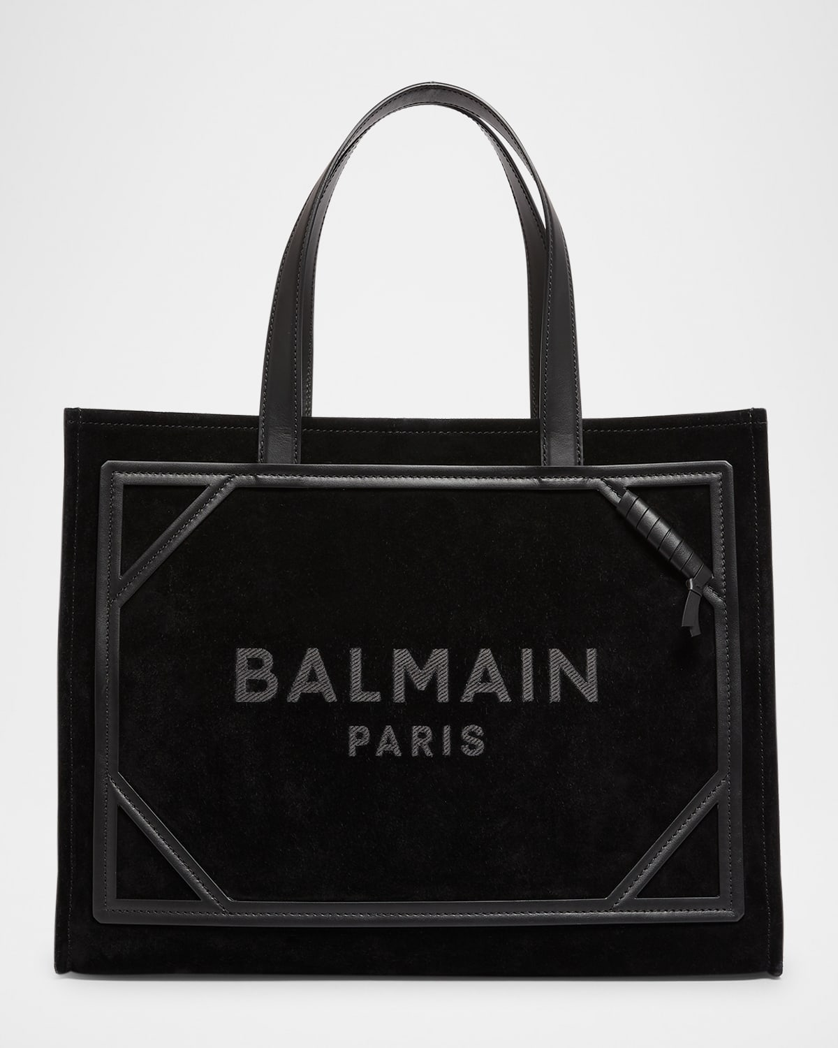Balmain "B Army" shopper tote bag in suede and leather Shoulder straps Open top with center strap closure Interior, one slip pocket and leashed flap pouch Approx. 13.2"H x 16.5"W x 5.9"D Made in Italy