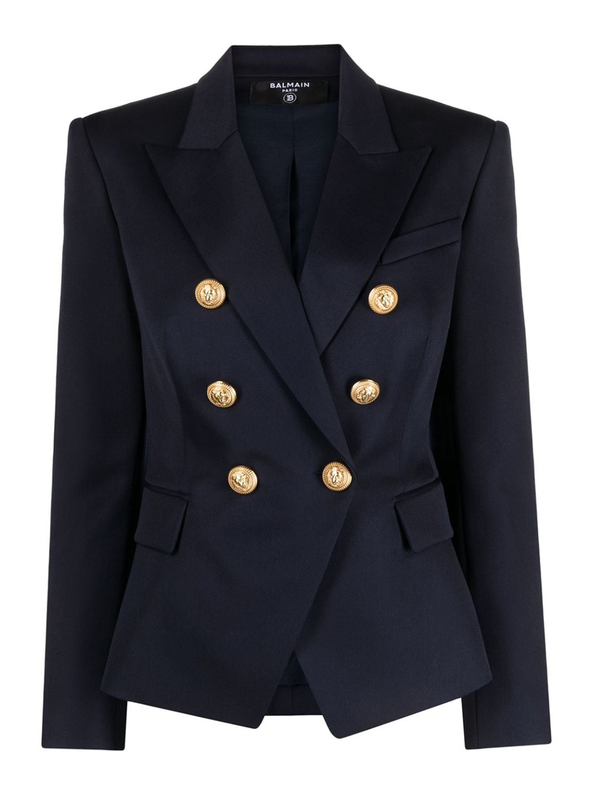 Blazer à double boutonnage en laine de la marque Balmain, orné de boutons dorés gaufrés en laine bleu marine, de revers pointus, d'une fermeture boutonnée à double boutonnage, d'une taille ajustée, de manches longues, d'une poche passepoilée sur la poitrine et de deux poches à rabat sur le devant