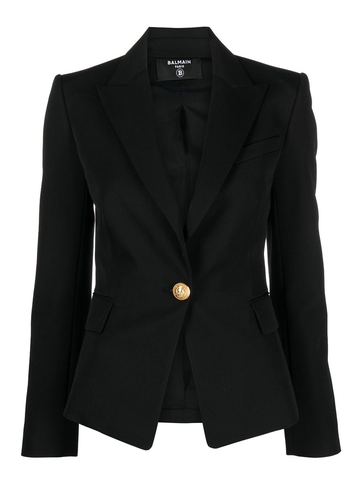 Blazer en laine à boutonnage simple de la marque Balmain orné d'un motif tête de lion en laine noire, de boutons dorés gaufrés, de revers pointus, d'épaulettes, de manches longues, de poignets boutonnés, d'une poche passepoilée sur la poitrine, de deux poches avant à rabat et d'un ourlet droit
