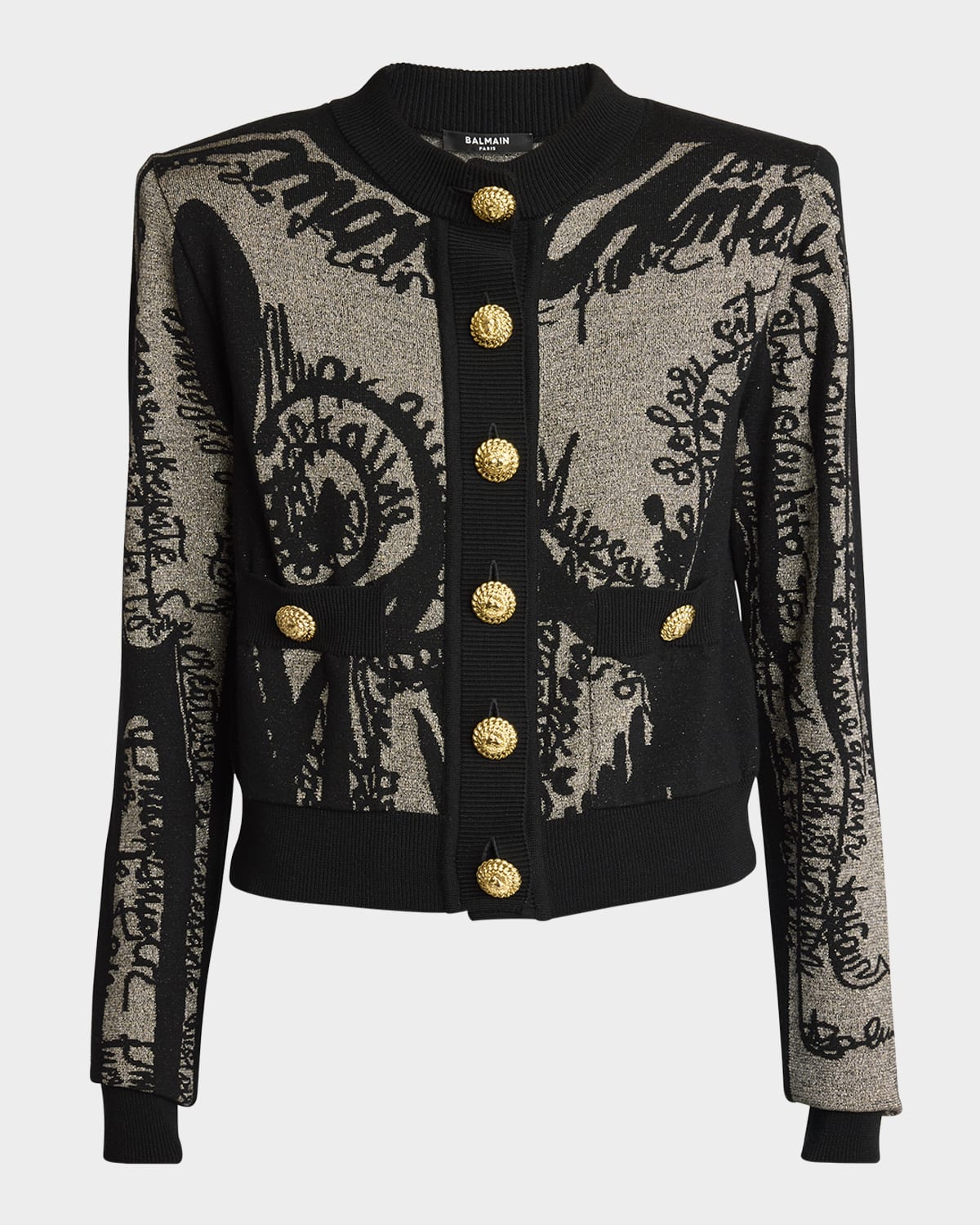 Balmain knit cardigan featuring body letter trompe l'oeil intarsia and passed shoulders Crew neckline; button front Long sleeves Side buttonwelt pockets Relaxed fit Ribbed cuffs and hem Merino wool Professional cleaning recommended Made in France