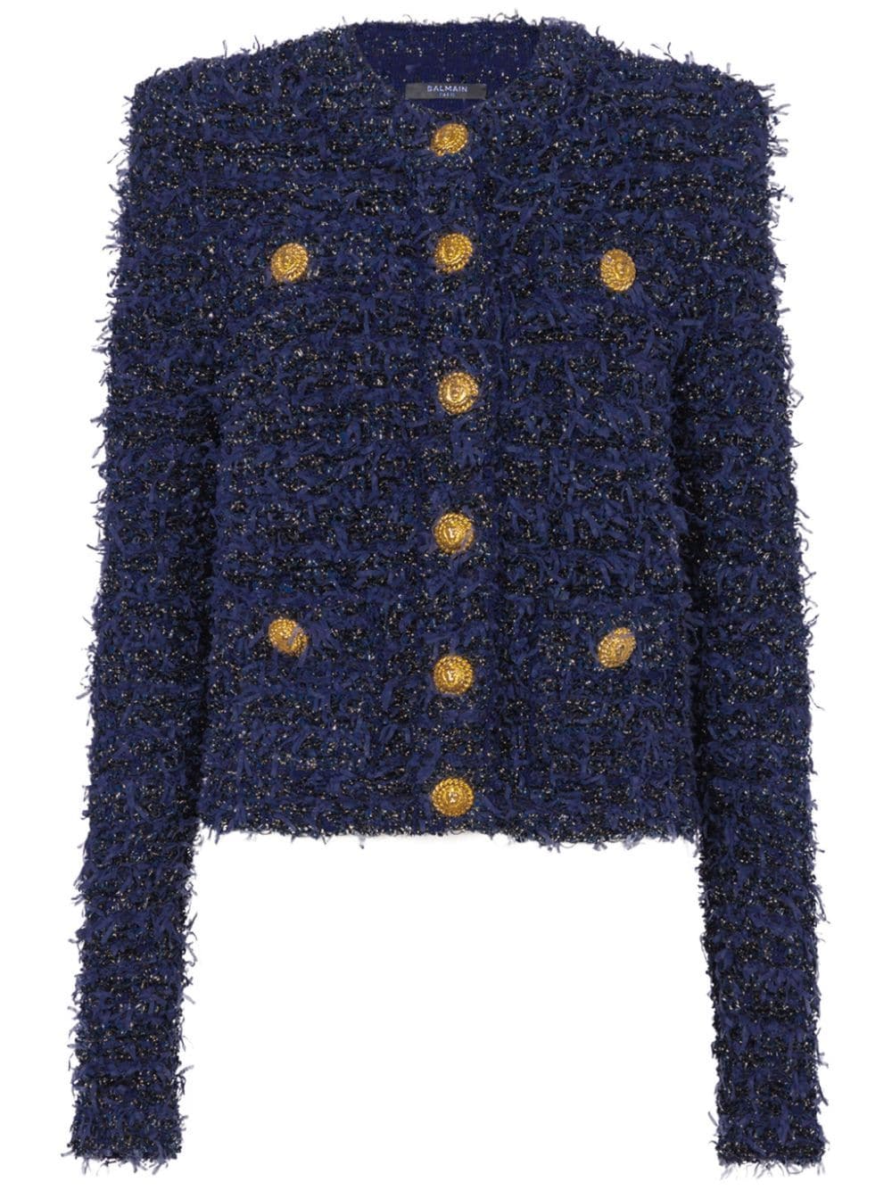 navy blue tweed metallic threading textured finish embossed gold-tone buttons collarless front press-stud fastening long sleeves press-stud fastening cuffs faux pocket detail two side patch pockets straight hem