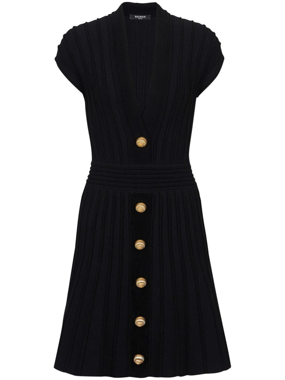 black stretch-design velvet embossed gold-tone buttons V-neck front button fastening pleat detailing short sleeves fitted waistline flared skirt