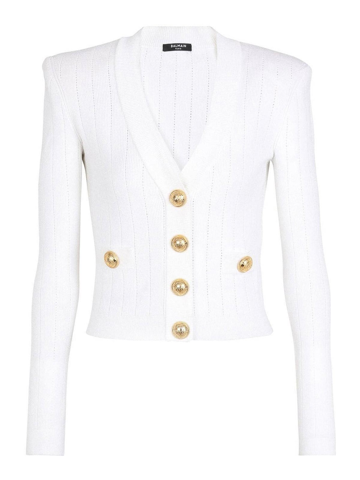 Construction en tricot blanc nuage gaufré, boutons ton sur ton, V plongeant, col boutonné, épaules, manches longues, deux poches plaquées, bordure côtelée, ourlet droit