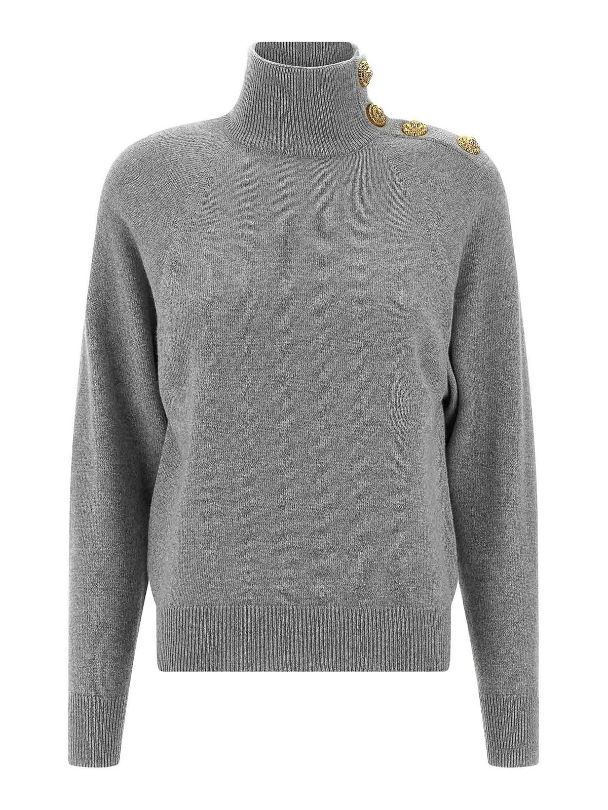 Pull en laine et col haut avec bouton « testa di leone » sur l'épaule gauche, manches chauve-souris longues avec poignets
