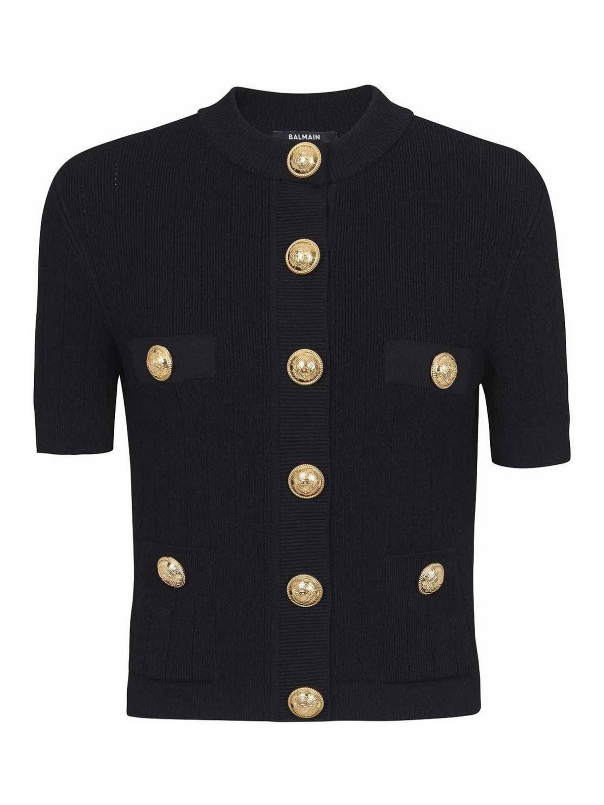 Manches courtes noires, col rond, boutons ton sur ton, raccourcis