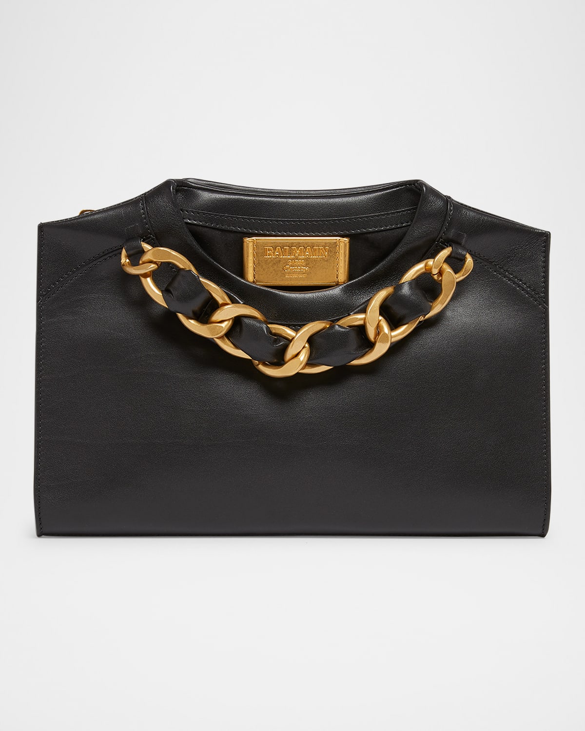 Balmain crewneck Tshirtshaped pouch clutch bag in calfskin leather Chunky chain hardware accent Zip top closure Interior, one slip pocket and one card slot Approx. 8.7"H x 12.2"W x 1.2"D Made in Italy