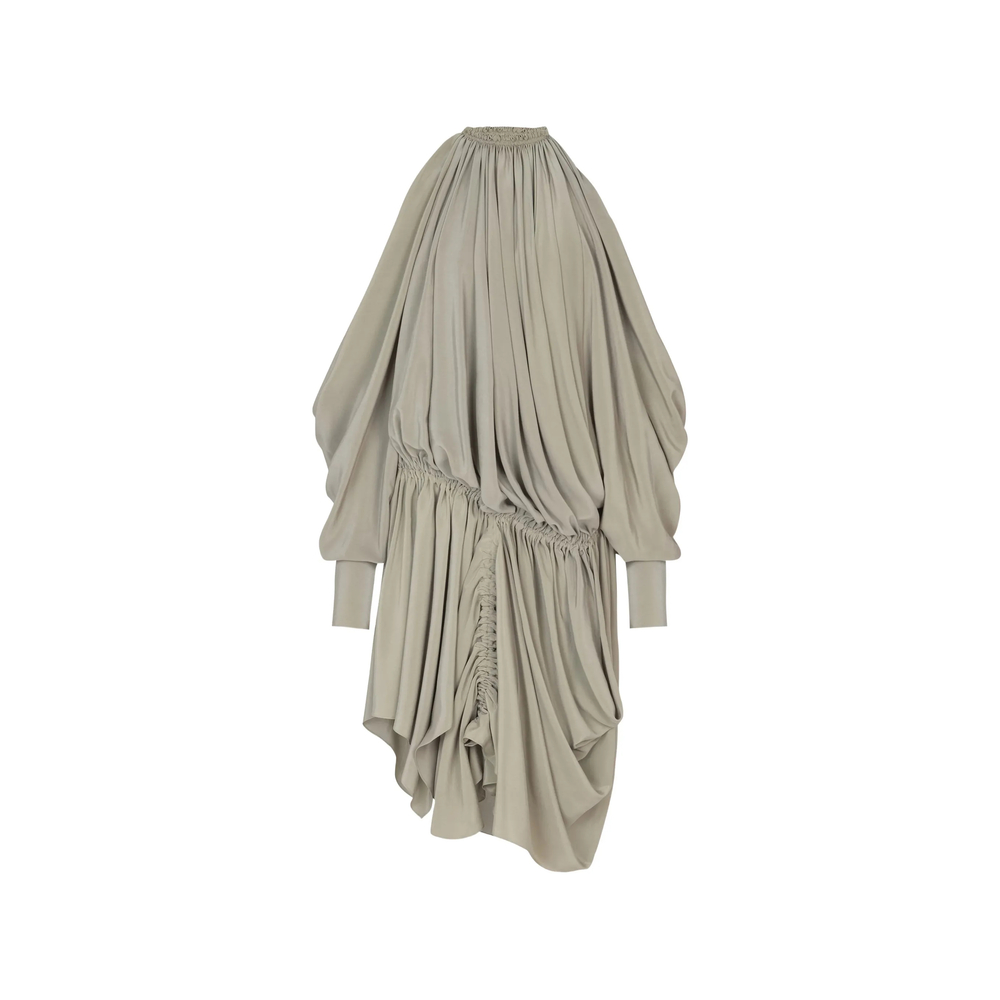 green draped design gathered details long sleeves asymmetric hem round neck open shoulders two side pockets