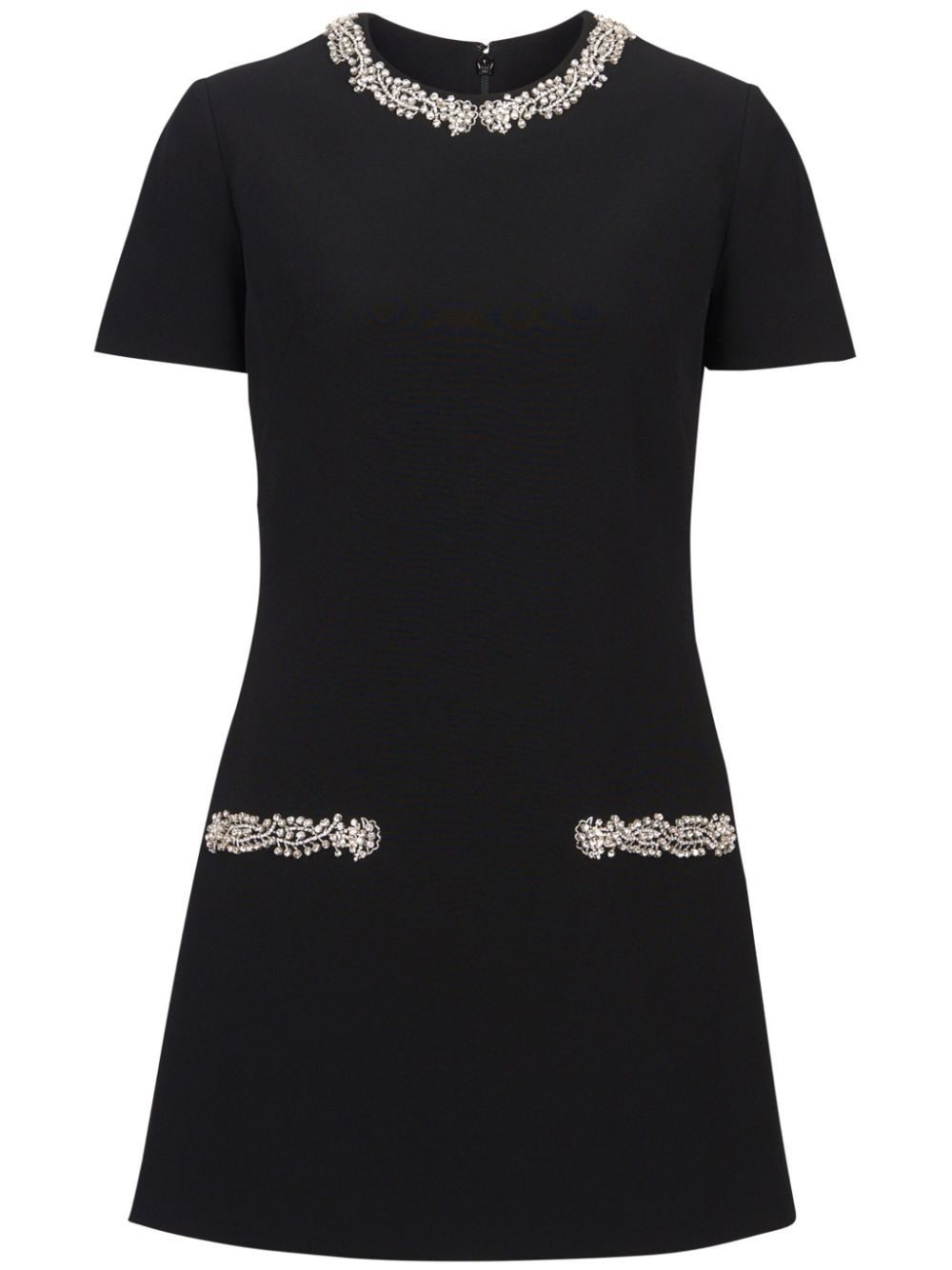 black crepe texture embroidered trim round neck beaded trim detail crystal embellishment concealed rear zip fastening short sleeves straight hem