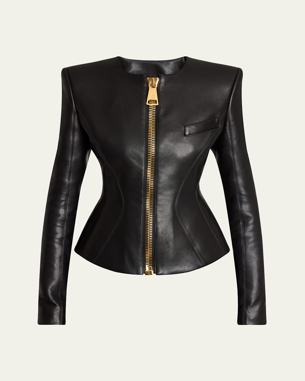 Crafted from smooth lambskin leather, this Balmain cropped jacket features chunky, goldtone hardware with signature logo engraving. Round neckline Long sleeves with zip cuffs Chest welt pocket Fitted silhouette Peplum hem Zipfront Leather Professional cleaning recommended Made in Bulgaria