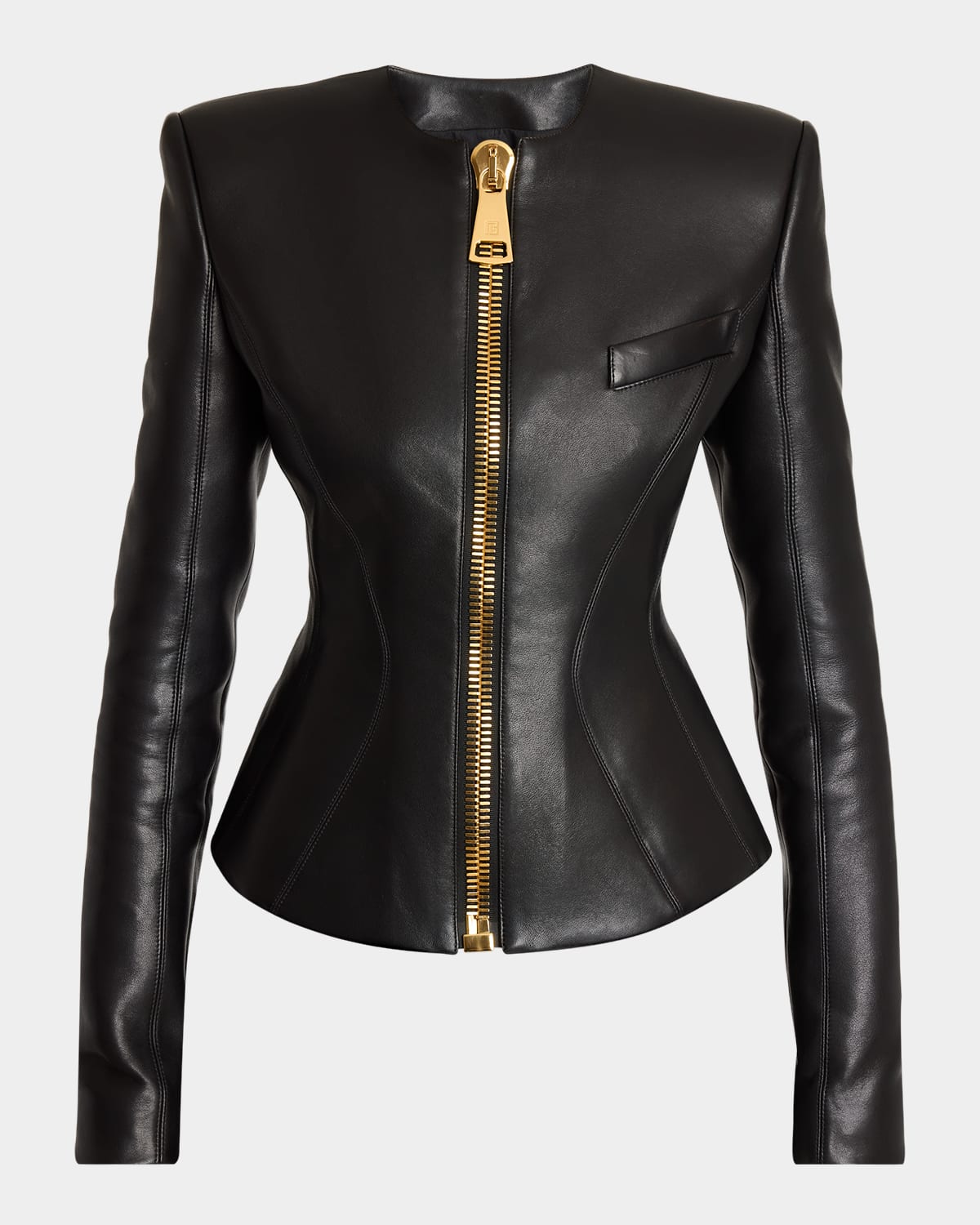 Crafted from smooth lambskin leather, this Balmain cropped jacket features chunky, goldtone hardware with signature logo engraving. Round neckline Long sleeves with zip cuffs Chest welt pocket Fitted silhouette Peplum hem Zipfront Leather Professional cleaning recommended Made in Bulgaria