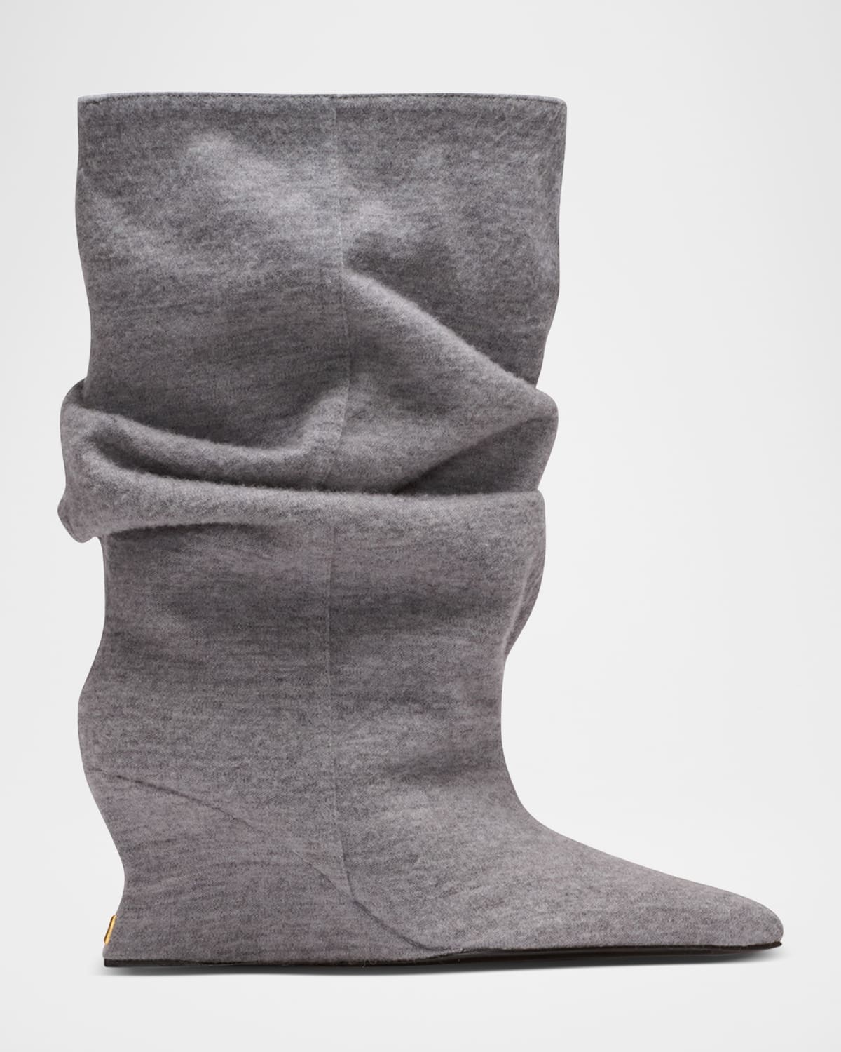 Crafted with a cozy flannel woolblend upper, these booties by Balmain feature textural gaiterstyle draping that can be pulled up or pushed down for versatile styling 3.00 in / 75 mm covered wedge heel Pointed toe Pullon style Leather outsole Spot clean Made in Italy